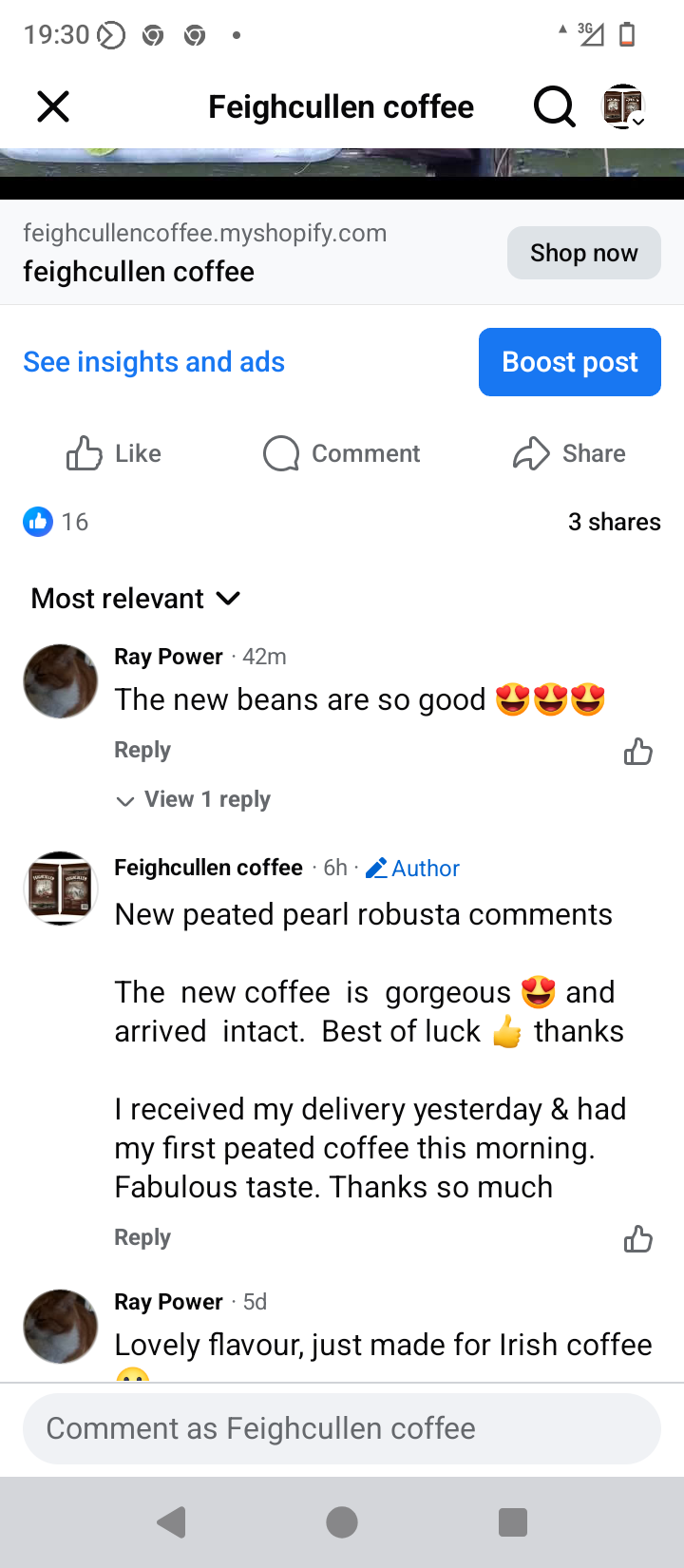 Feighcullen coffee uses nitrogen burning peat this has different and positive effects, smoother caffeine is a big one but its also the best coffee for healthy bowel movements!